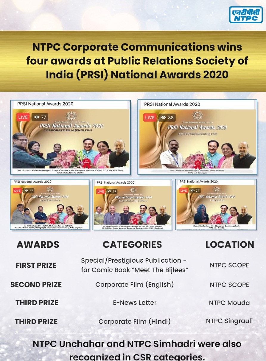 NTPC Ltd, India’s largest energy integrated company bagged four awards at the Public Relations Society of India (PRSI) National Awards 2020 in a virtual award ceremony. NTPC corporate communications team was awarded for the exemplary work done by team throughout the year.